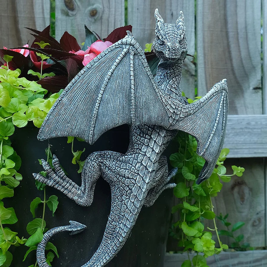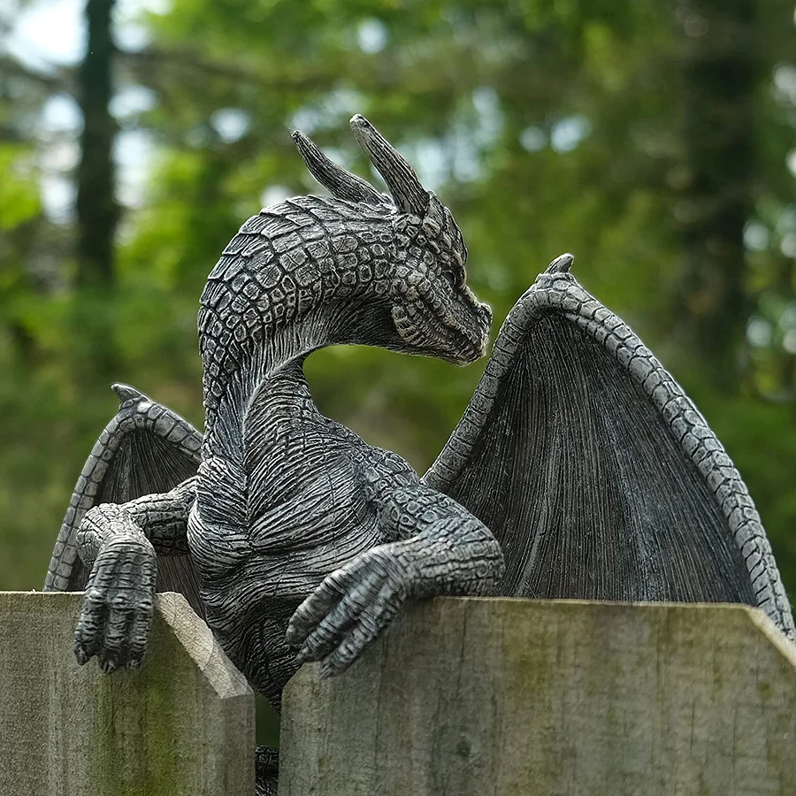 Ideal for outdoor fencing, patio and porch railings, garden walls, yard decor and more, the winged mythical dragon tree hugger features four flat surfaces, the front legs reaching upward hooking over the top of the fence and the hind feet resting on the fence for added stability.